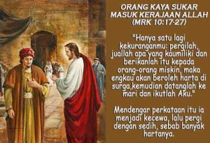 Akan tetapi, orang kaya itu sudah sedemikian terikat dengan harta kekayaannya sehingga dia sulit untuk melepaskannya dan lupa apa hal yang paling penting untuk memperoleh kehidupan kekal. Padahal, Yesus hanya meminta hal yang sangat praktis, yakni percaya kepada-Nya dan kita akan memperoleh segala sesuatu bahkan lebih dari yang dapat kita pikirkan atau bayangkan. Pada Yesus ada lebih banyak harta bila kita dengan tulus dan total mempercayakan diri kepada-Nya. Tetapi orang kaya itu kurang bijaksana. Dia lebih memilih menikmati harta kekayaan duniawi daripada kehidupan kekal. Karena itulah Yesus berkata: “Lebih mudah seekor unta melewati lubang jarum daripada seorang kaya masuk ke dalam Kerajaan Allah.”